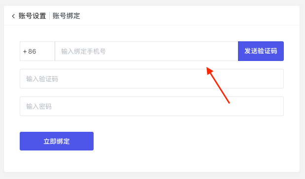 输入区号和手机号,发送验证码,再输入验证码和密码即可立即绑定。