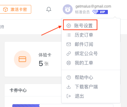 登陆官网个人中心,点击右上角的账号,选择「账号设置」