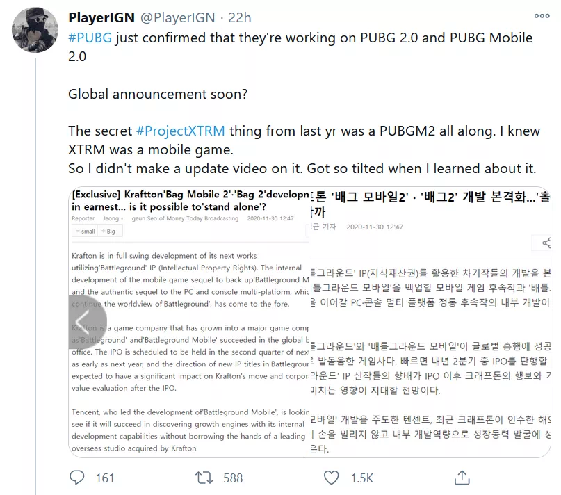 这篇报导的刊登日期是2020年11月30日,内容大意主要是讲述《PUBG 2》正在开发中,而且有很大的可能是将会登陆PC以及手机平台。