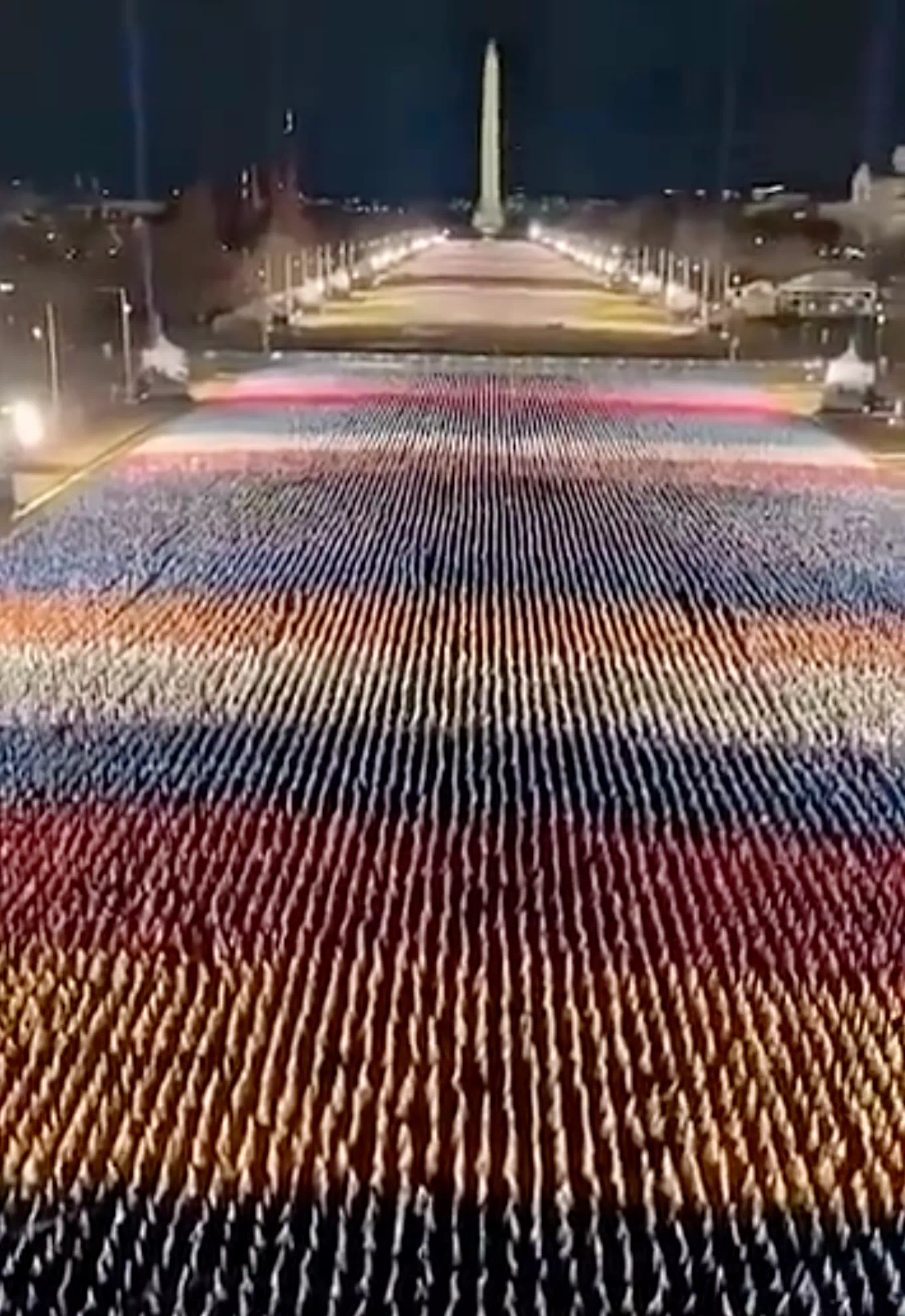 虽然因为疫情安全,也考虑到不久前的国会暴乱,原本容纳20万广场,现场观礼的人数只有1000人左右。为了填上原本20万人的空缺,国家广场的空地上插上了20万面小彩旗。