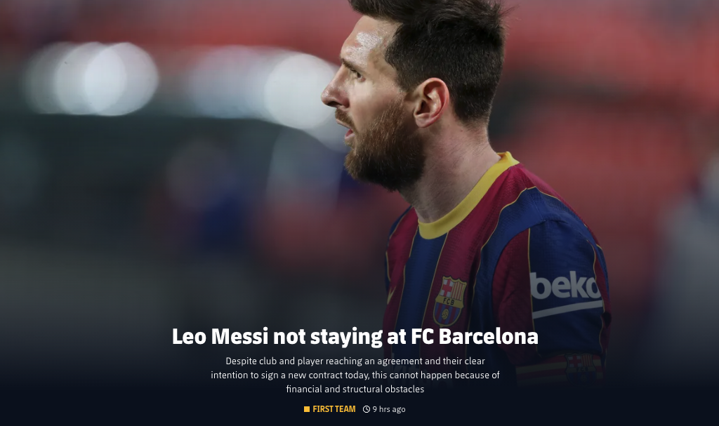 声明中表示,尽管俱乐部与梅西双方均已达成在当天签署新合约的协议,但由于经济和西甲联盟相关政策等原因,双方无法正式将协议落实,在这样的情况下梅西将无法继续为巴萨俱乐部效力,双方均对这一结果表示遗憾,巴萨俱乐部感谢梅西对俱乐部的巨大贡献,并祝愿梅西未来的个人生活和事业一切顺利。
