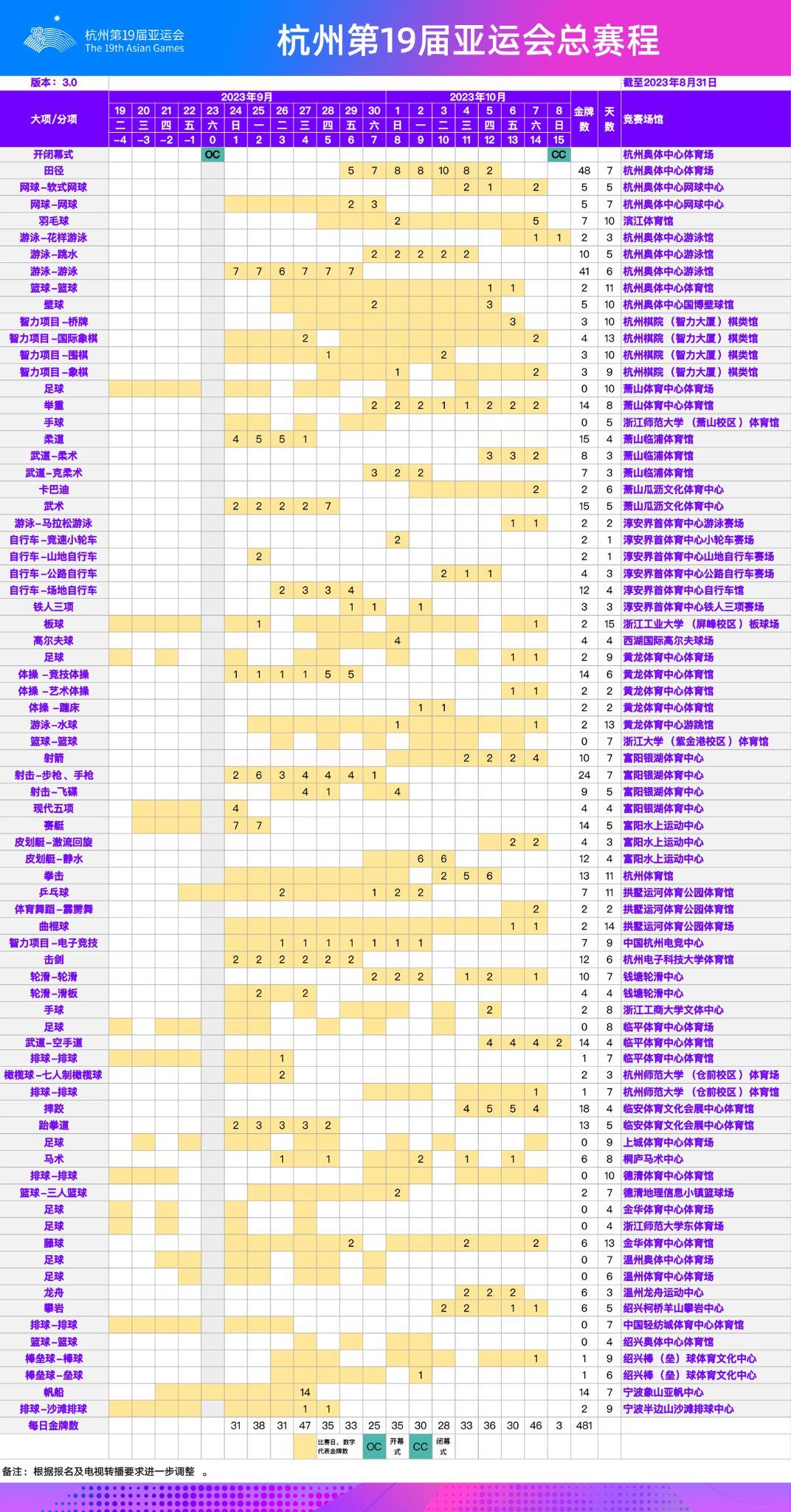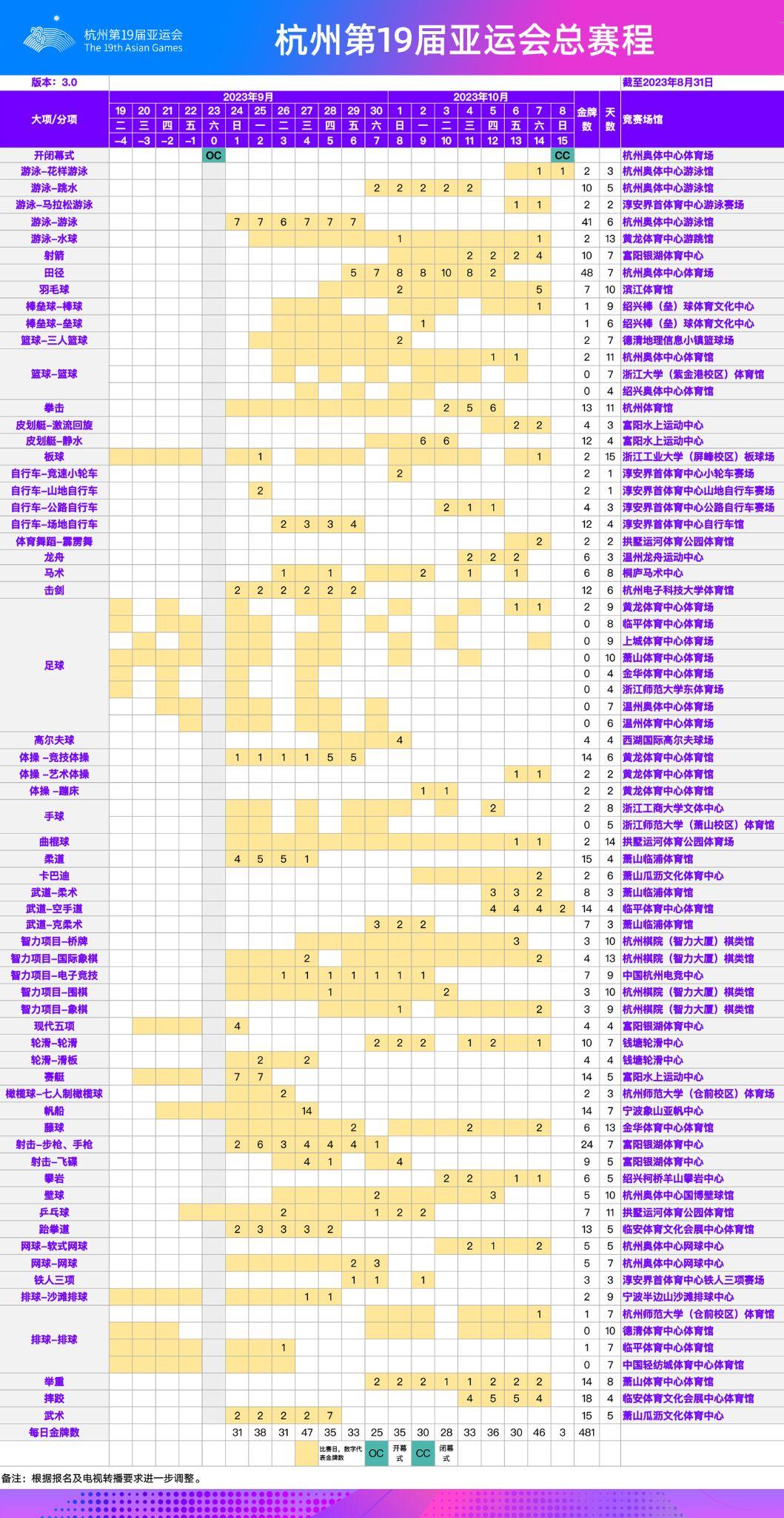 杭州亚运会最新版总赛程。其中板球、足球、现代五项、赛艇、帆船、乒乓球、沙滩排球、排球等部分项目将在杭州亚运会开幕前率先开赛,其余的杭州亚运会赛事项目将在2023年9月24日后首场开赛也将迎来首个金牌,杭州亚运会共有40个大项、61个分项、481个小项及宁波、温州、金华、绍兴等五座协办城市。