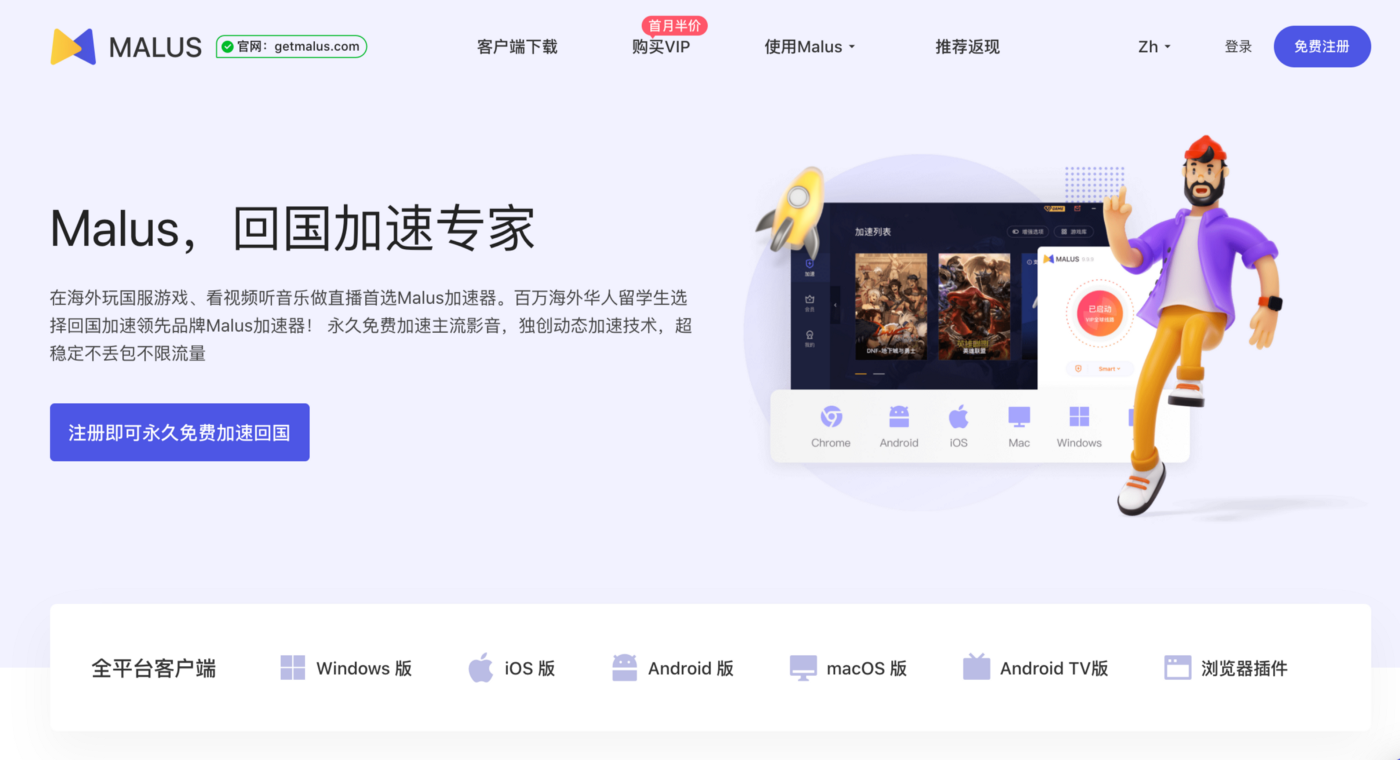 推荐下载海外华人都在用的回国游戏加速器——Malus加速器,一键回国,降低海外游戏延迟,还能解除爱奇艺、腾讯视频、优酷、bilibili、QQ音乐、网易云音乐、直播姬、YY语音等地区限制。