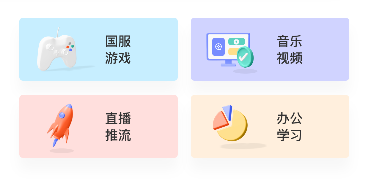* 多种模式选择,多场景支持加速音乐、视频、游戏和直播,多样的选择