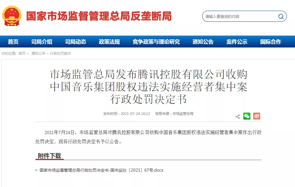 7月24日,国家市场监管总局公布《行政处罚决定书》。除了罚款50万元以外,还责令腾讯及其关联公司采取相关措施恢复相关市场竞争状态。