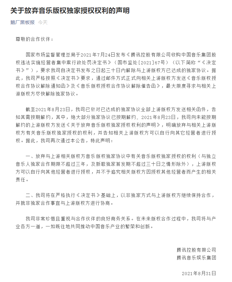“截至8月23日,我司已针对已达成的独家协议全部上游版权方发送相关函件,告知其需按期解约,其中,绝大部分独家协议已按期解约。”腾讯称,未能按期解约的,其放弃音乐版权独家授权权利。