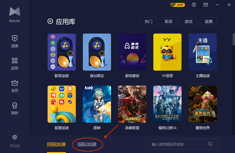 1、更新版本后,打开Malus客户端,在下方可以看到新增了【国际加速】这个tag。