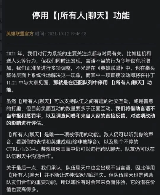 近日,英雄联盟官方发布的一条公告显示,下个版本将会停用【所有人聊天】功能: