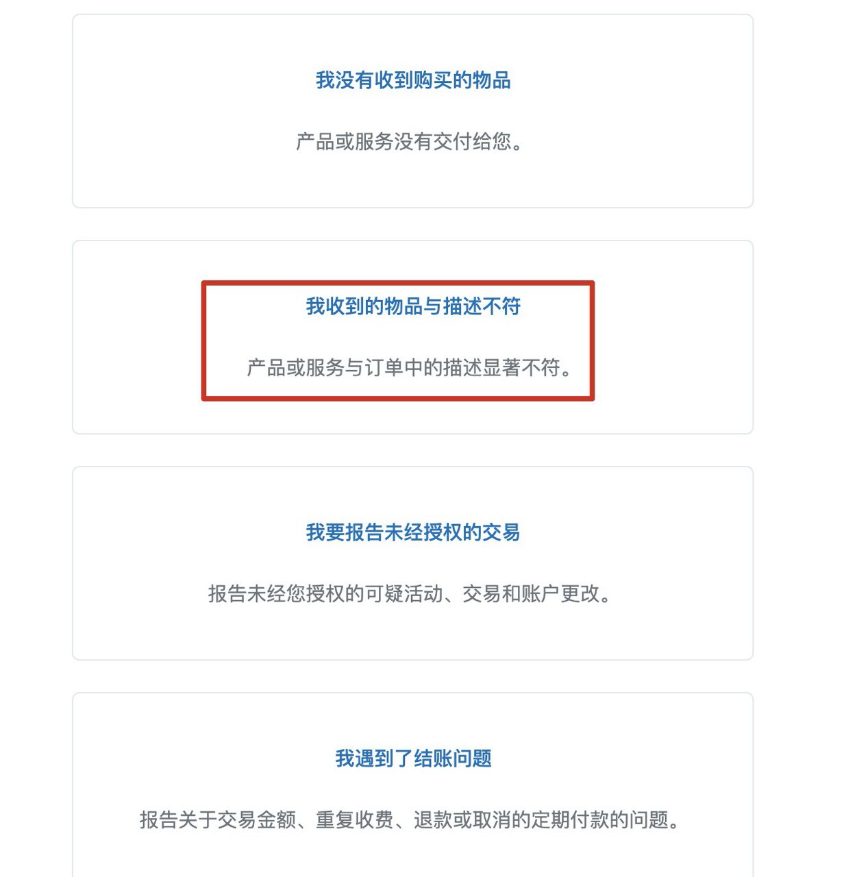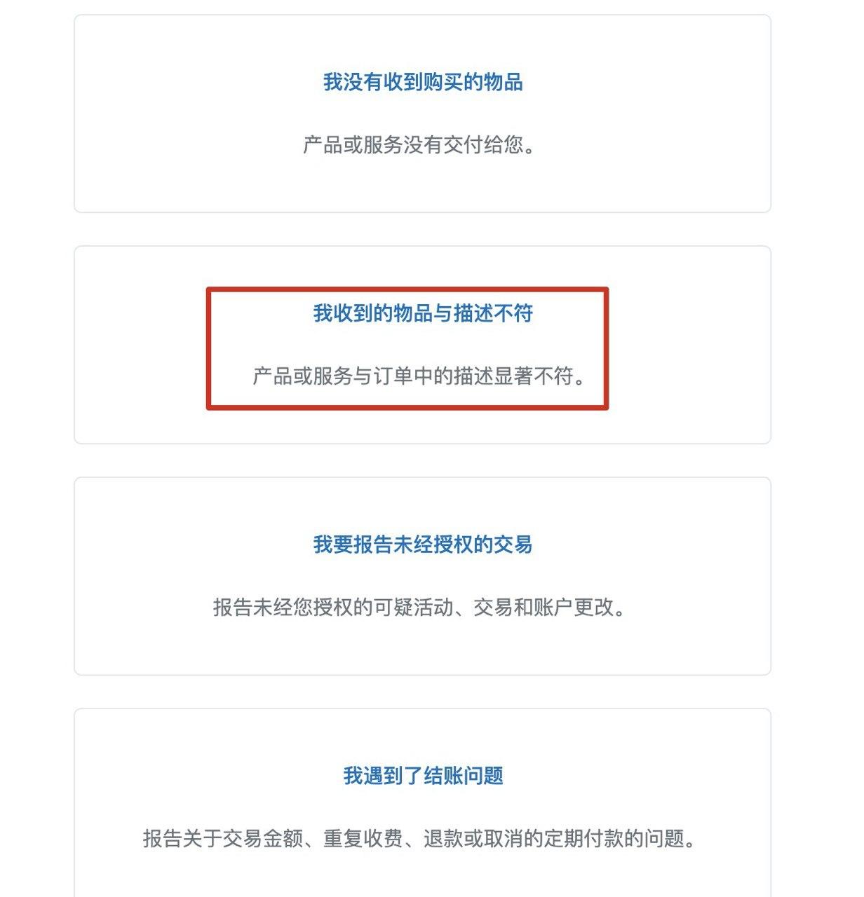 选择【我收到的物品与描述不符】,填写信息说明情况申请退款,耐心等待PayPal回复,注意查收邮件。