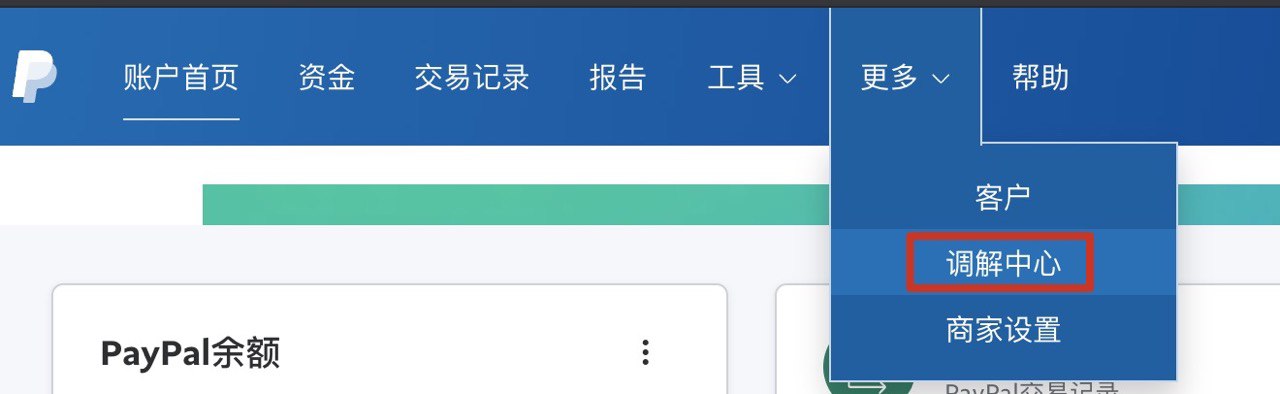 登录你的PayPal账号后,在菜单栏点【更多】-【调解中心】