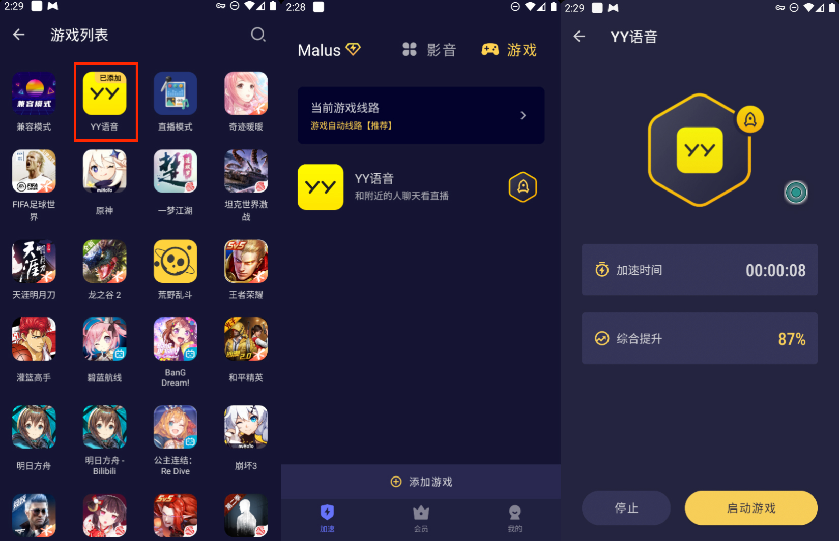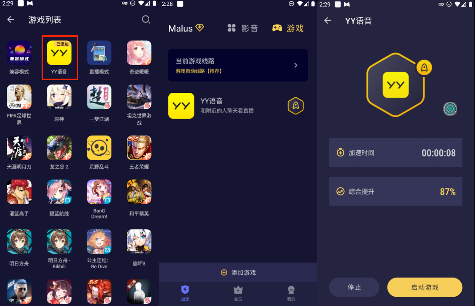 打开 Malus 加速器,切换到游戏 TAB,在游戏库单独添加 YY 语音应用,开启加速并重启 YY 语音。