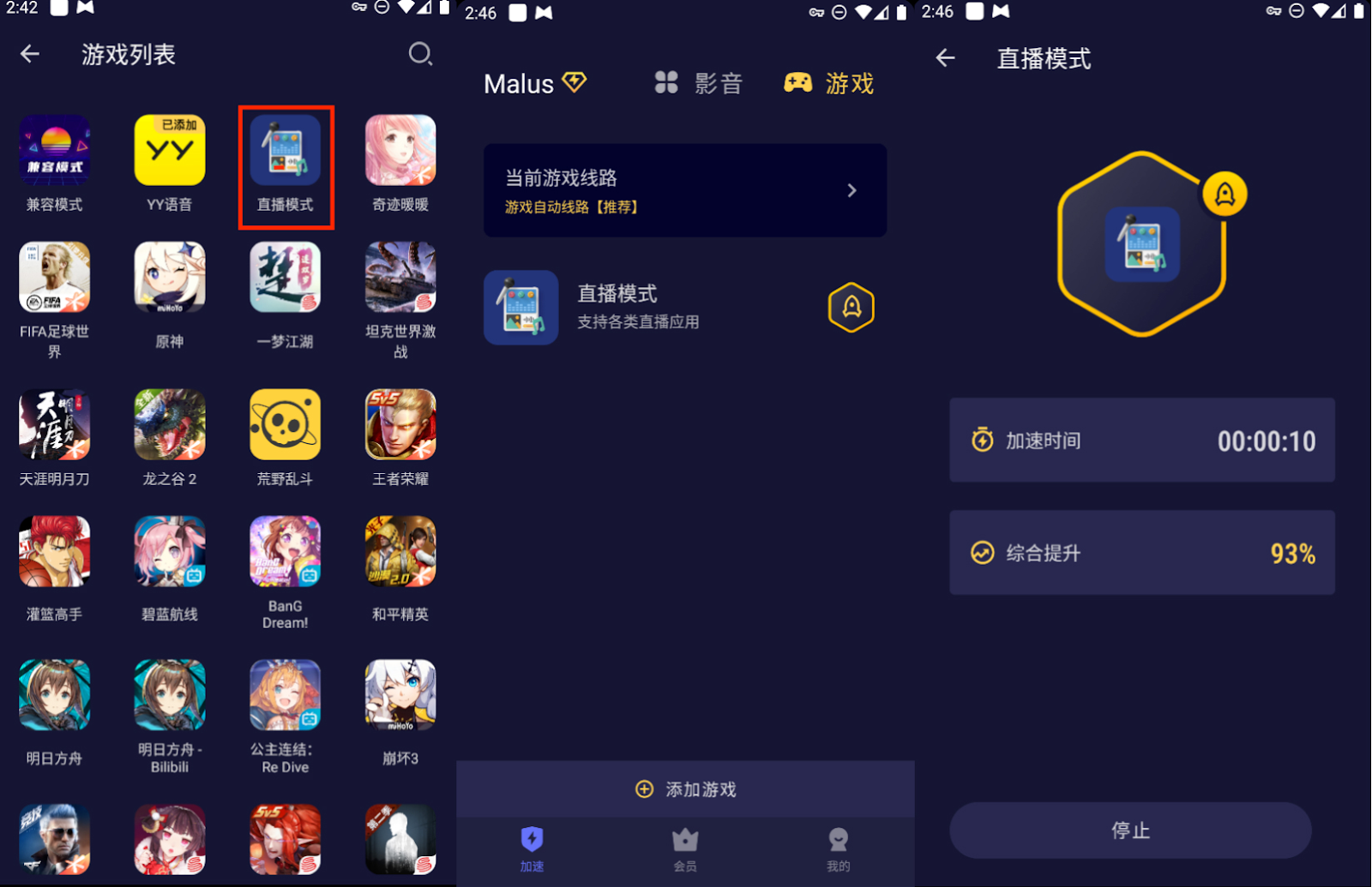 打开 Malus 加速器,切换到游戏 TAB,在游戏库单独添加直播模式,开启加速并重启直播软件。