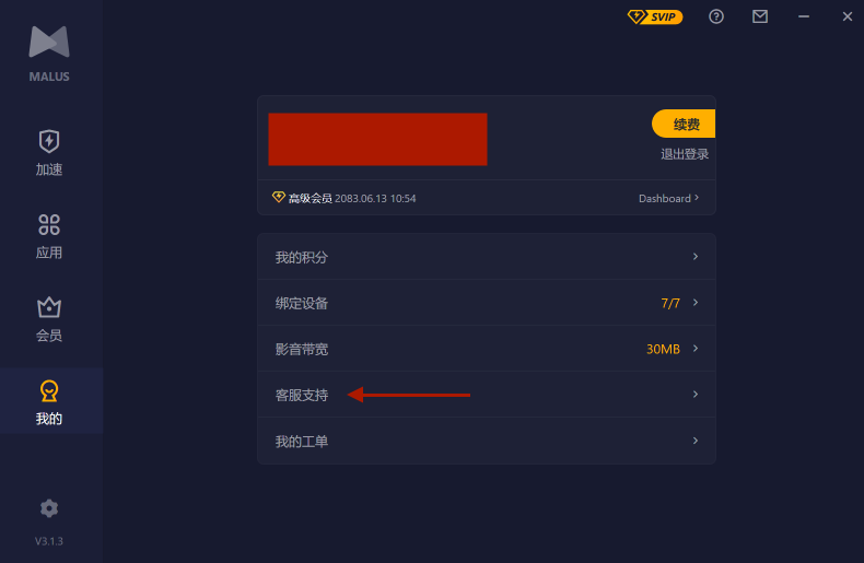 1、打开Malus,点击左侧「我的」- 「客服支持」